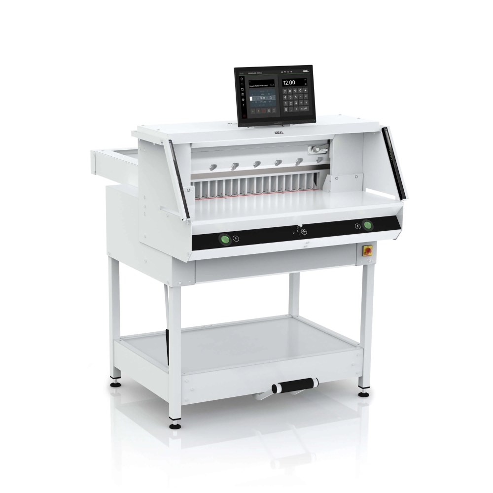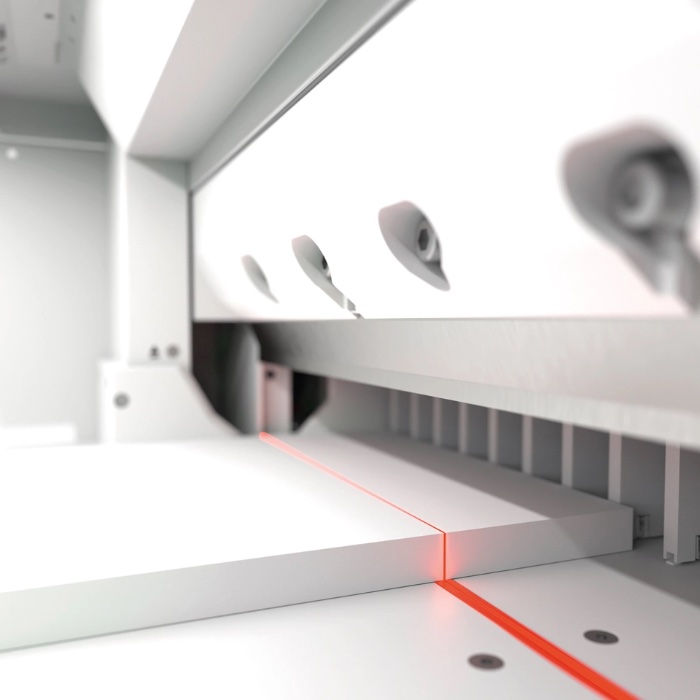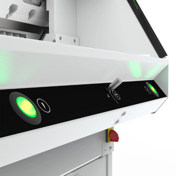La Triumph Speedcut 68 es la guillotina de papel hidráulica programable de última generación que optimiza la eficiencia y la productividad gracias a sus funciones avanzadas. Su pantalla multitáctil de 15.6 pulgadas ofrece un software intuitivo con un manejo sencillo mediante gestos táctiles, proporcionando una pantalla principal clara y una visualización inteligentemente dividida. La pantalla, con inclinación ajustable, se puede personalizar para adaptarse a la altura del usuario y a las condiciones de iluminación. La precisión está garantizada gracias al ajuste manual del tope trasero, que se acciona mediante un elemento de control ergonómico. El manejo seguro a dos manos se logra con botones de activación de corte EASY-TOUCH y señales ópticas integradas. La abrazadera mecánica para el pie cuenta con un sistema de pre-sujeción ergonómico y patentado, además de una función de indicación de la línea de corte, ofreciendo máxima comodidad y precisión.